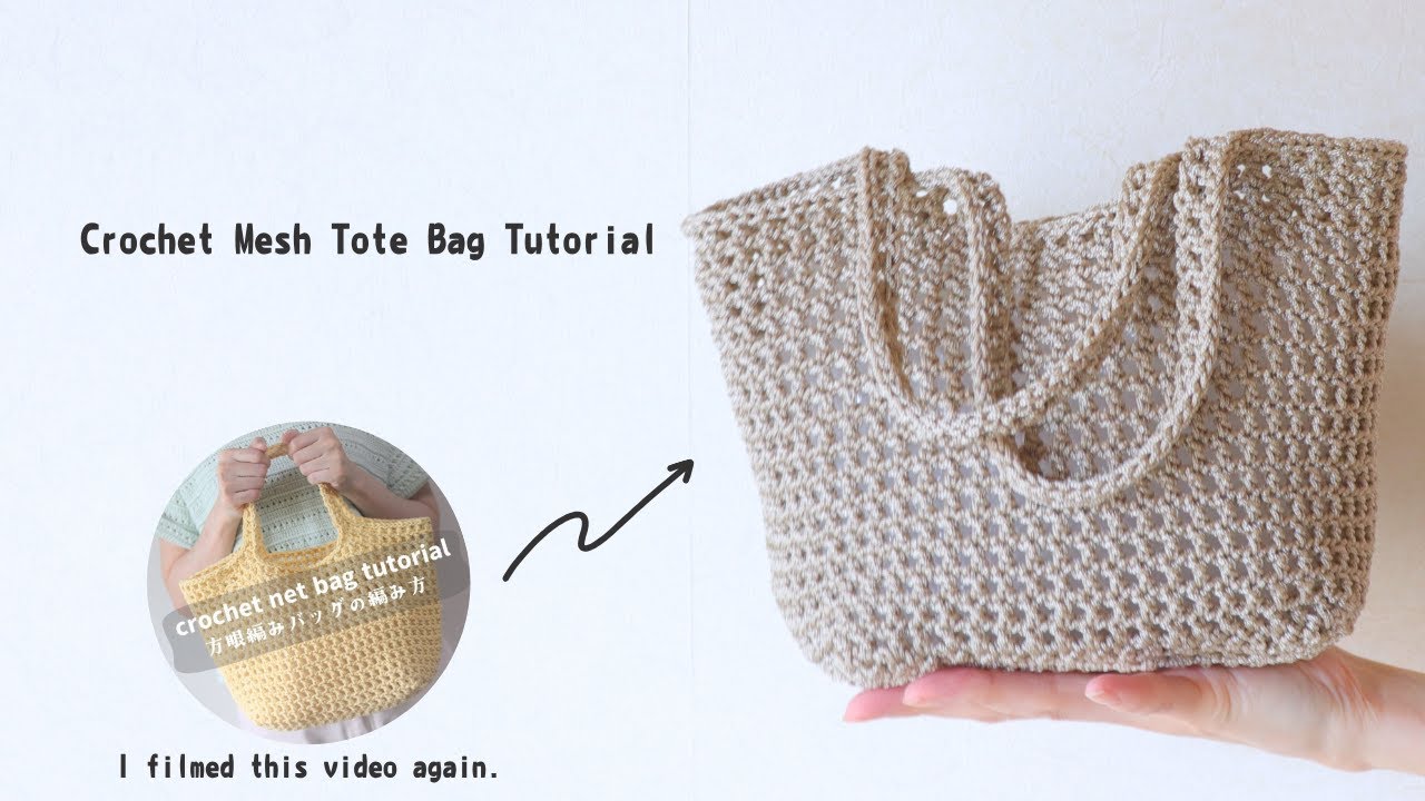 かぎ針編み メッシュバッグの編み方 方眼編み 100均毛糸 トートバッグ 編み方動画 おさらい crochet mesh bag tutorial – オリンアム