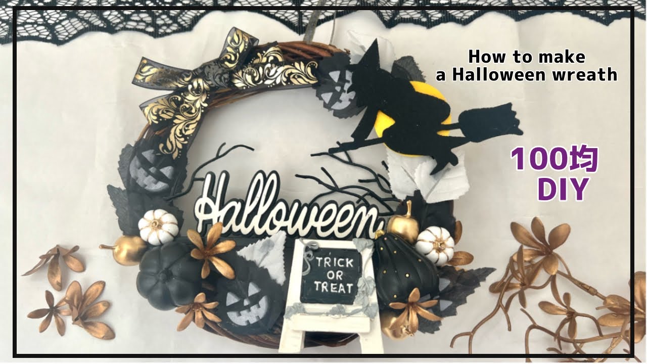 説明文#100均diy #100均アレンジ #ハロウィンリース白、黒、ゴールドカラーのおしゃれなハロウィンリースの作り方です。材料は全て100均ダイソーとセリアです...